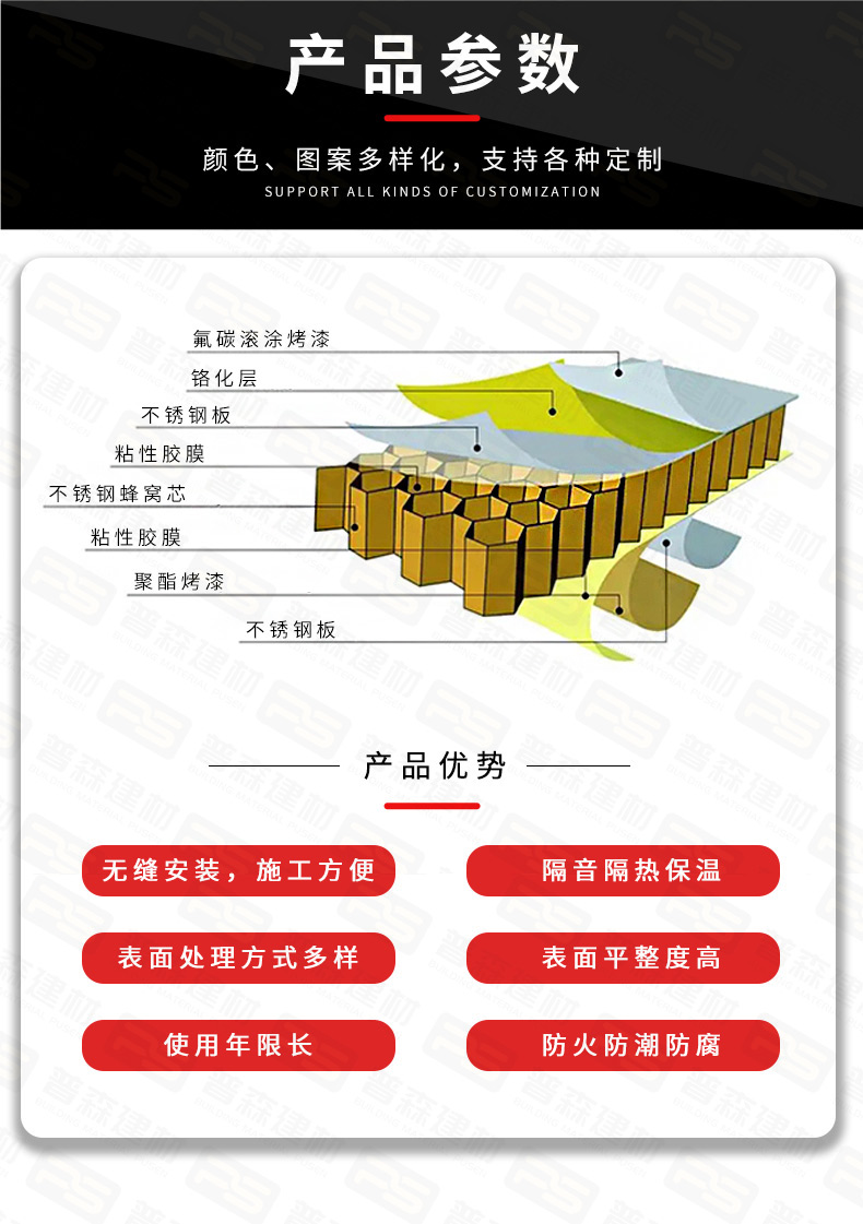 產(chǎn)品結(jié)構(gòu):不銹鋼板+鋁蜂窩芯+鍍鋅底板(鋁板)